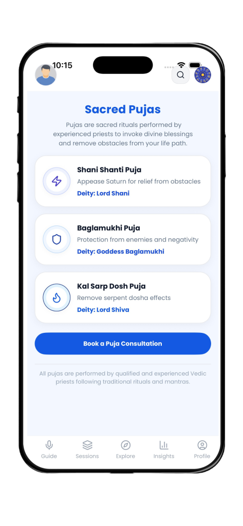 - Guided Rituals: Access step-by-step video or audio guides to perform Pujas with confidence at home.