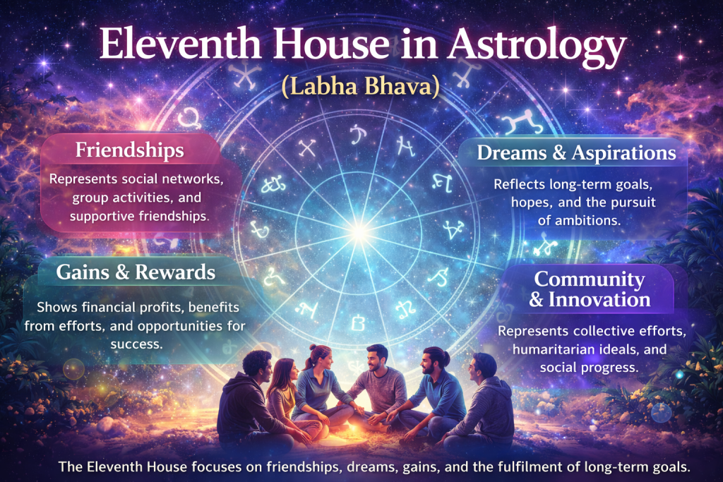 The Eleventh House in astrology represents aspirations, friendships, social networks, and the fulfillment of dreams. Known as Labha Bhava in Vedic astrology, it reflects gains, achievements, and rewards that arise from dedication and collaboration.